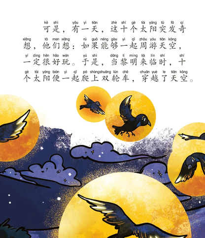 《后羿射日的神话》说的是在很久很久以前,天空曾出现过十个太阳,这些太阳一起放出的热量烤焦了大地,人们生活在苦难中。这时一个叫作后羿的英雄出现了,他登上大山拉开神弓,射掉了九个太阳,但最后一个太阳却害怕得躲了起来,于是人们请求天帝让第十个太阳出来工作,从此,大地上的万物得以生存,人们过上了幸福的生活。
