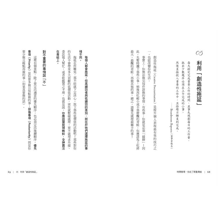 全书引用马克.吐温名句:「假如你每天早上第一件事就是生吃一隻青蛙,接下来的一天就会过得比较顺利。因为你很清楚,这可能是一天中最糟糕的事情了。」