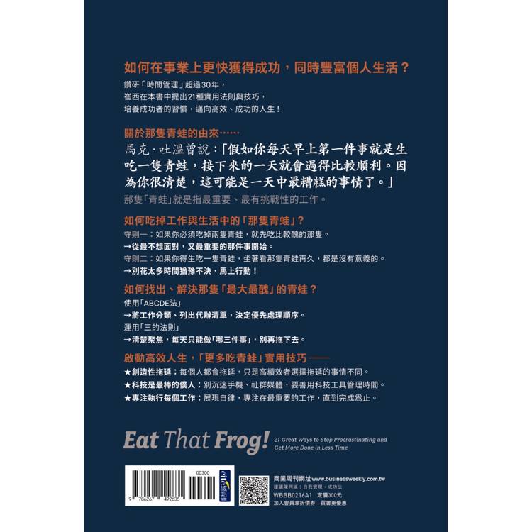 鑽研「时间管理」超过30年,成功学大师布莱恩・崔西要透过本书,21种实用法则与技巧,教你「一口一口吃掉那隻青蛙」,反覆练习这些技巧,培养成功者的习惯,迈向高效、成功的人生。