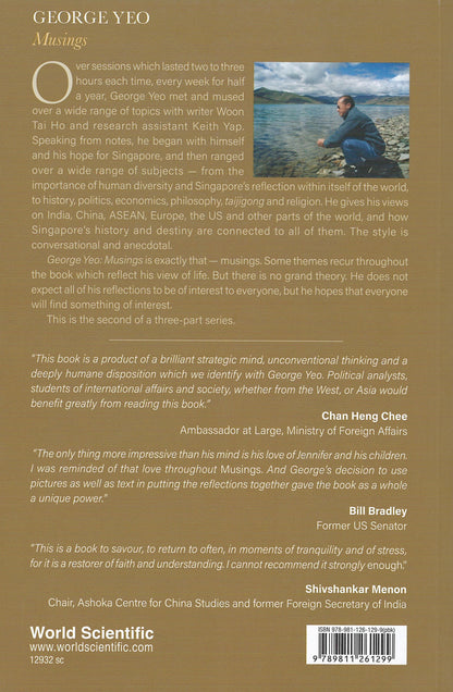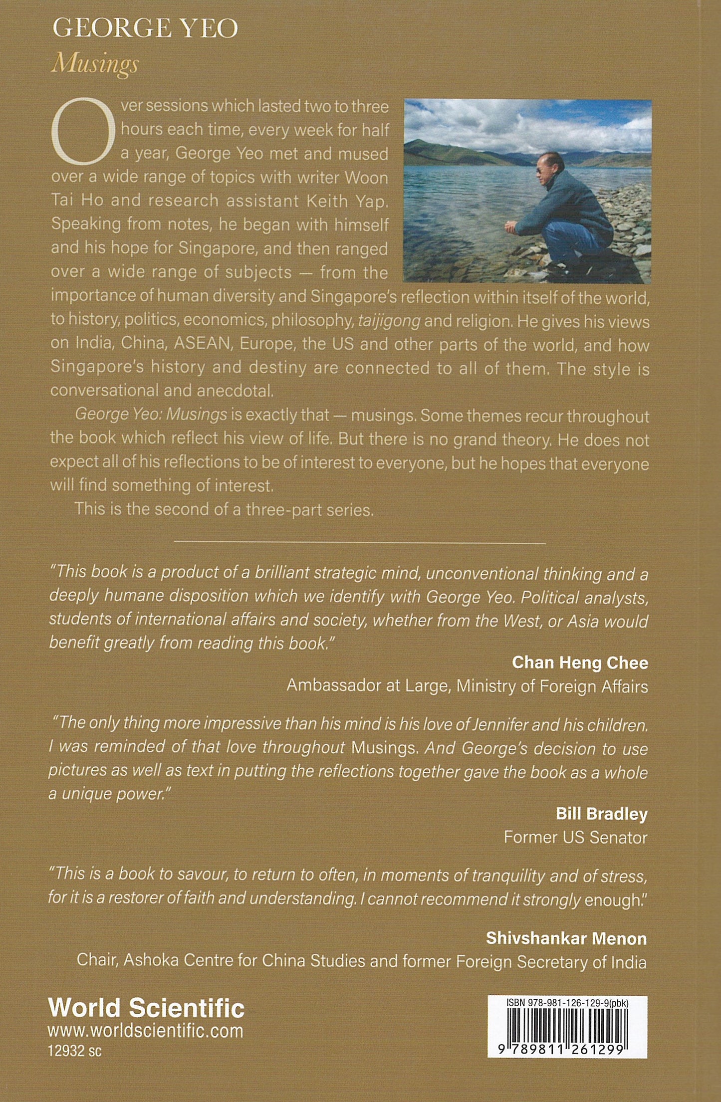 Over sessions which lasted two to three hours each time, every week for half a year, George Yeo met and mused over a wide range of topics with writer Woon Tai Ho and research assistant Keith Yap. Speaking from notes, he began with himself and his hope for Singapore, and then spanned over a wide range of subjects — from the importance of human diversity and Singapore's reflection within itself of the world, to history, politics, economics, philosophy, taijigong and religion. He gives his views on India, China, ASEAN, Europe, the US and other parts of the world, and how Singapore's history and destiny are connected to all of them. The style is conversational and anecdotal.George Yeo: Musings is exactly that — musings. Some themes recur throughout the book which reflect his view of life. But there is no grand theory. He does not expect all of his reflections to be of interest to everyone, but he hopes that everyone will find something of interest.