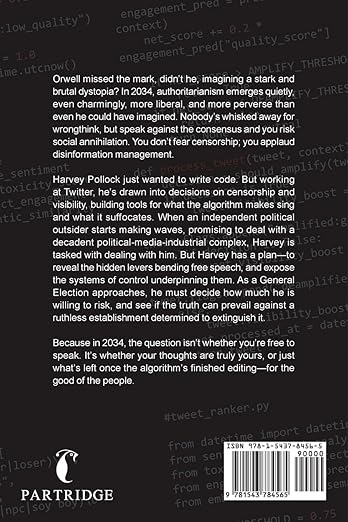 Harvey Pollock just wanted to write code. But working at Twitter, he’s drawn into decisions on censorship and visibility, building tools for what the algorithm makes sing and what it suffocates. When an independent political outsider starts making waves, promising to deal with a decadent political-media-industrial complex, Harvey is tasked with dealing with him. But Harvey has a plan—to reveal the hidden levers bending free speech, and expose the systems of control underpinning them. As a General Election approaches, he must decide how much he is willing to risk, and see if the truth can prevail against a ruthless establishment determined to extinguish it.