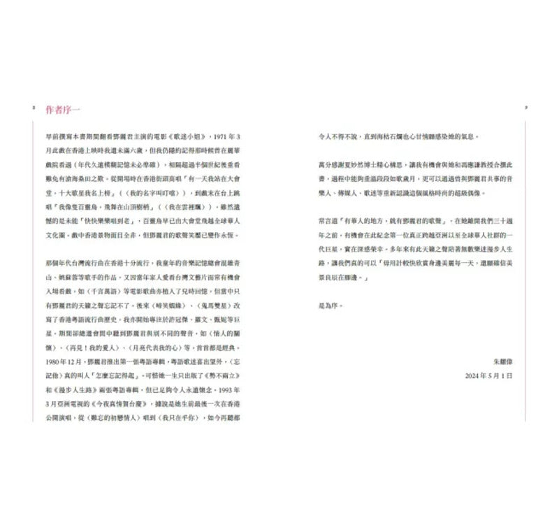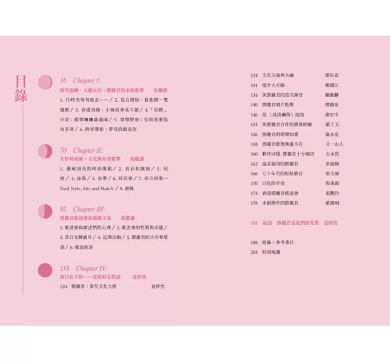 首先是朱耀伟教授撰写的〈时空流转.天籁长存:邓丽君的永恒歌声〉,由邓丽君11岁参加歌唱香港比赛开始,到她由台湾到再到日本发展的历程,如何由「神童歌女」到「永恒情人」,进行了详细的纪录及分析,同时回顾了七八十年代香港乐坛的盛景。