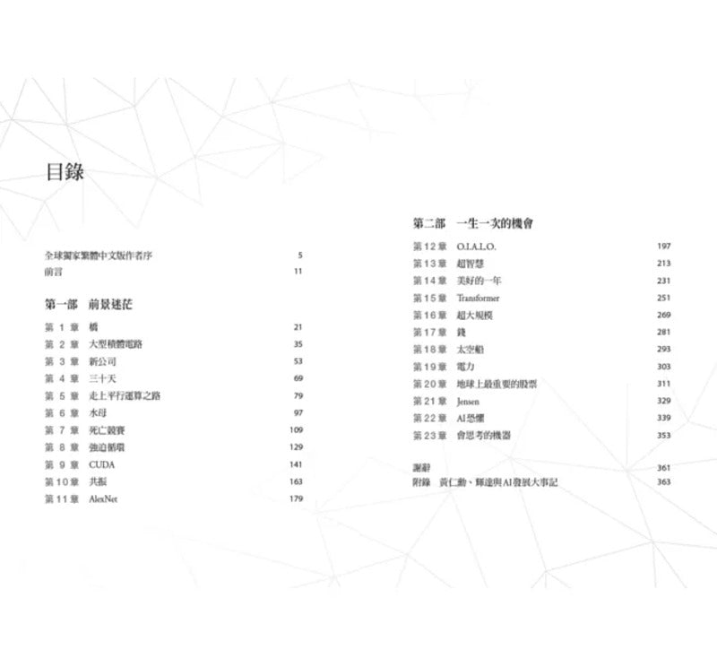 想要了解黄仁勋矛盾的人格特质与过人的洞察力、想要了解辉达与众不同的企业精神与商业优势、想要了解AI的软体与硬体如何结合并创造出惊人的运算能力,这本书满载最完整的资讯与解答。
